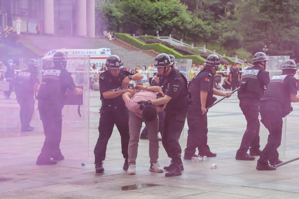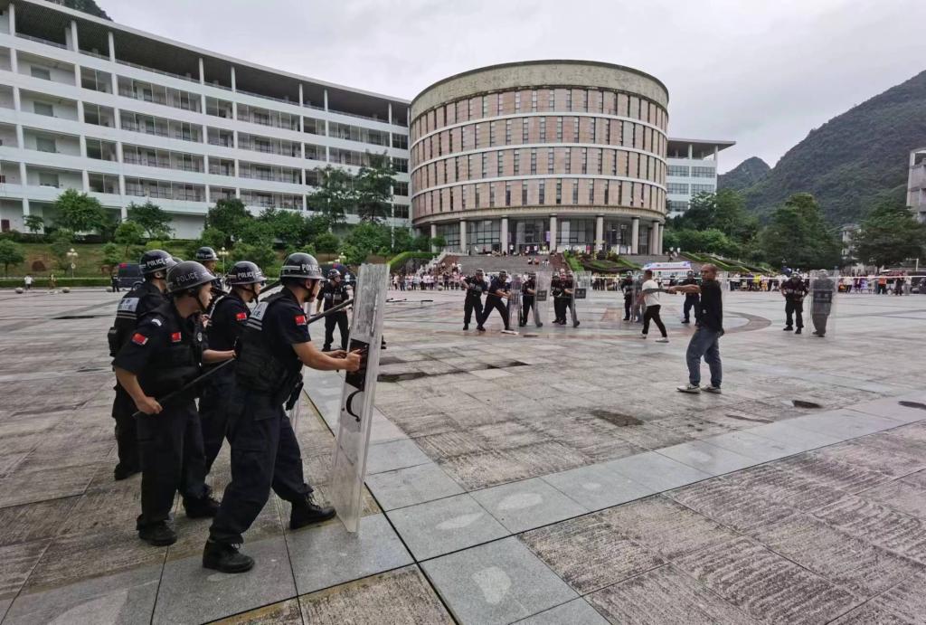 演练开始,四名退伍军人学生扮演的恐怖分子,携带刀械潜入至学校逸夫楼广场,劫持砍伤两名学生,并持续追砍无辜人员。学校保安发现险情后,立即做出反应,一队保安身着防暴服,使用防暴器械与恐怖分子展开周旋,另一队保安大声呼喊警示,组织师生迅速撤离现场,同时报警请求支援。宜州分局接警后,立即组织巡警大队民警迅速赶到现场,在学校保安人员协作配合下,成功控制恐怖分子、解救人质。演练过程中,着重体现了联动快速堵截、紧急调度增援、强攻解救人质、综合搜排隐患等内容,充分展示了各种反恐综合战术的运用,各环节配合默契、处置得当,达到预期效果。
