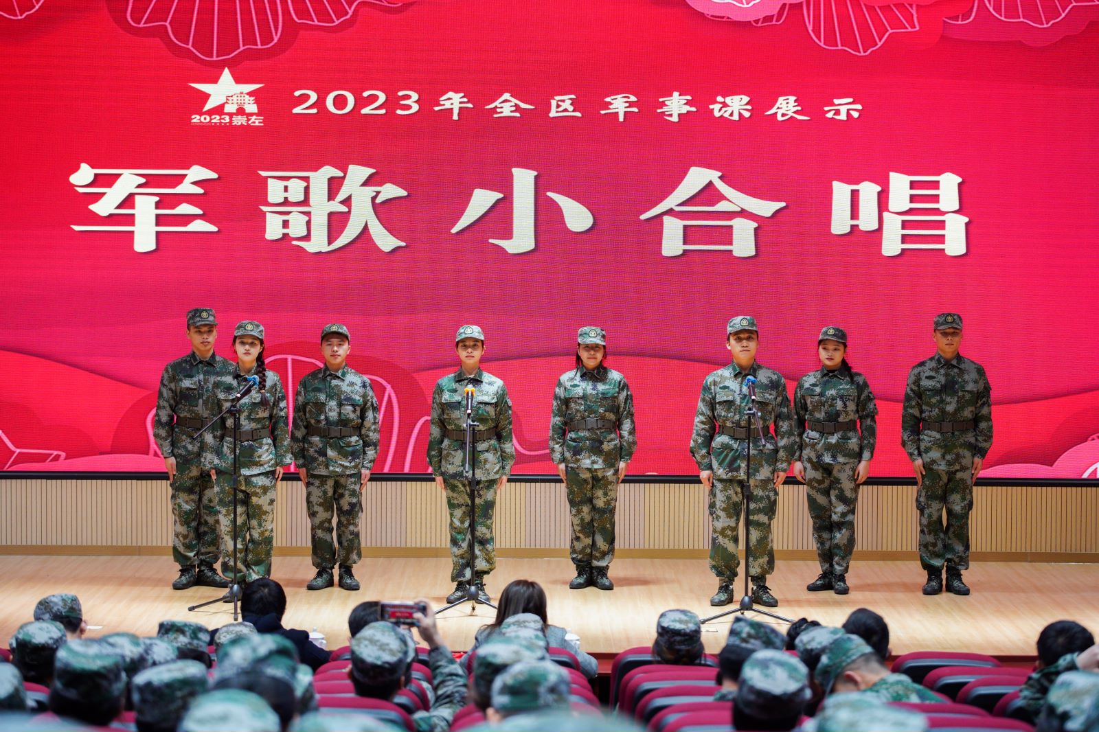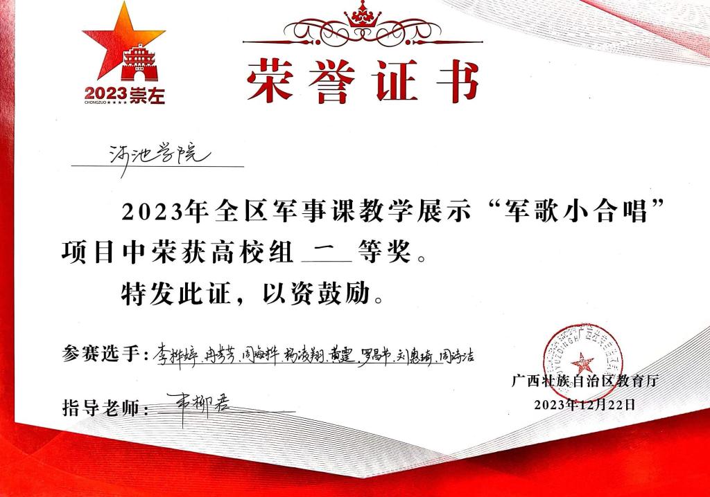 本次军事课教学展示内容包括军歌小合唱、无线电测向、军事理论知识考核、无人机操控、手榴弹投掷、国旗护卫队展示、文艺汇演等,来自全区11个高校代表队和12个高中代表队参加了展示活动。BWIN必赢由文学与传媒学院刘惠琦、人工智能与制造学院杨淩翔、化学与生物工程学院黄霆、教师教育学院罗昌节和音乐舞蹈学院周海桦、冉芳芳、李桦婷、周诗洁共8位同学组成代表队,在保卫处王家健老师带队下参加本次活动,最终由韦柳君老师指导的军歌小合唱项目获得高校组第一名,荣获一等奖;由韦庆进老师指导的无人机操控项目获得二等奖,其他项目获得三等奖及高校组综合三等奖。