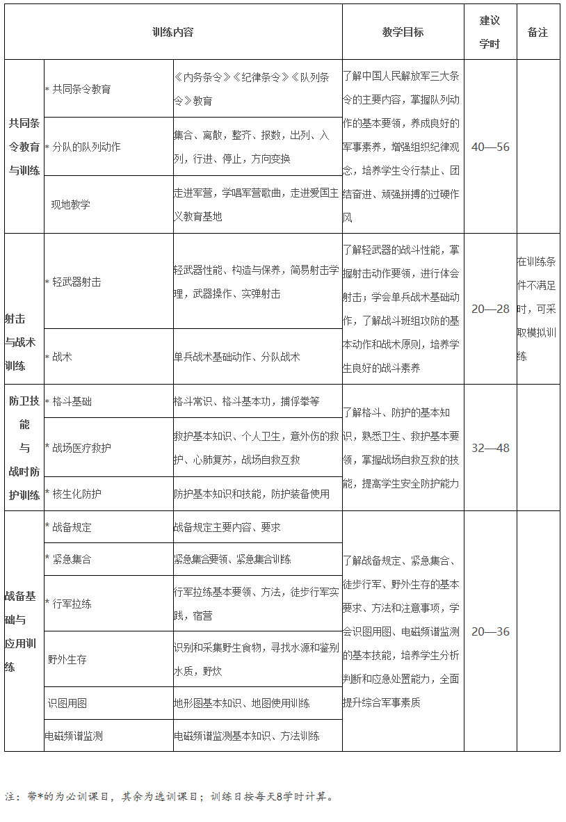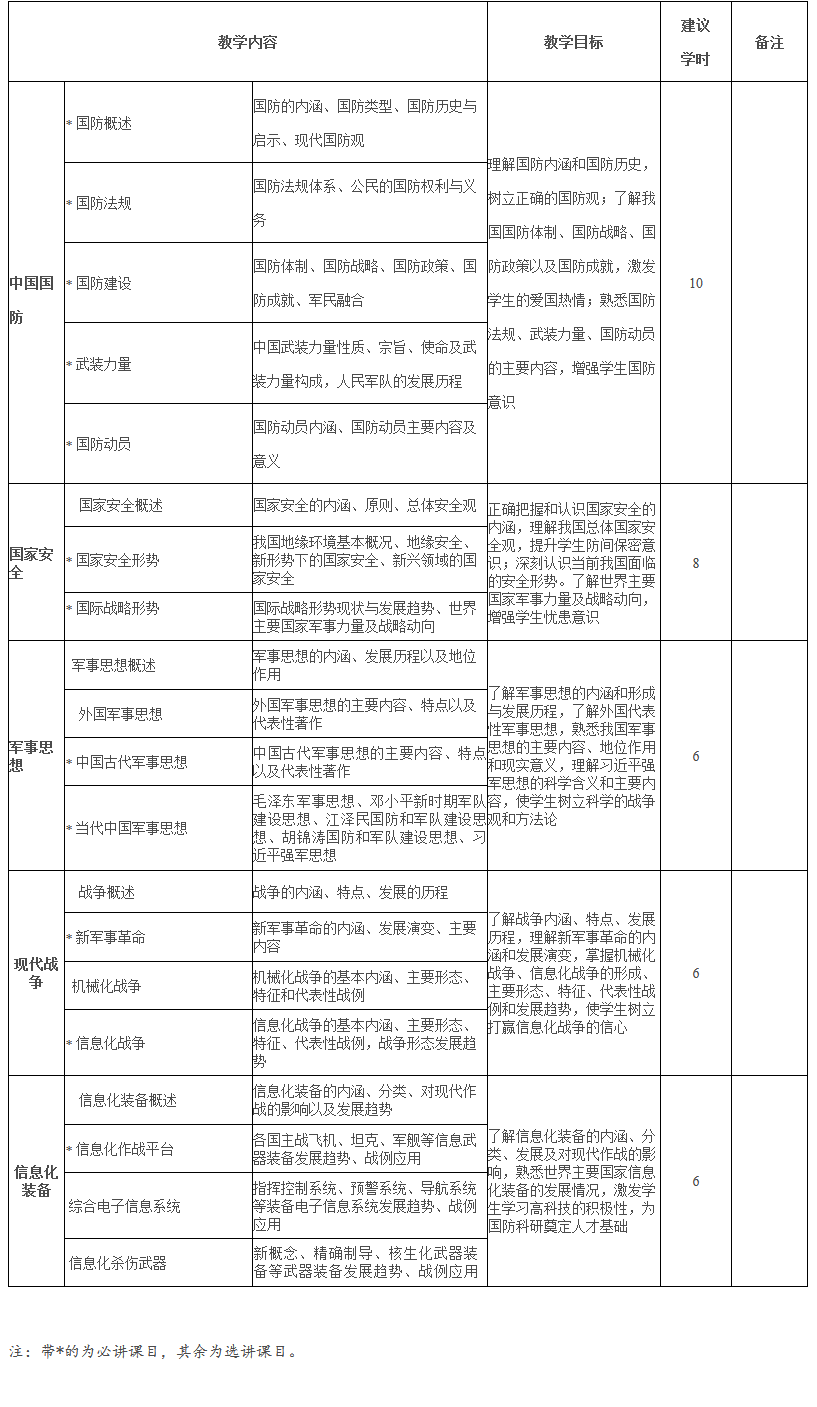 军事课由《军事理论》《军事技能》两部分组成。《军事理论》教学时数36学时,记2学分;《军事技能》训练时间2—3周,实际训练时间不得少于14天112学时,记2学分。课程内容含“必讲(必训)”内容(以“*”标识)和“选讲(选训)”内容(其他未标识者),各学校可根据本校实际情况在确保完成“必讲(必训)”内容的基础上,灵活选择“选讲(选训)”内容,但必须完成总学时。